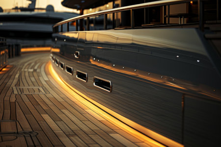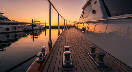 Luxury yacht docked at a tranquil marina during a vibrant sunset, with golden light reflecting on the calm water and polished deck. The low angle highlights the sleek design and wooden planks.