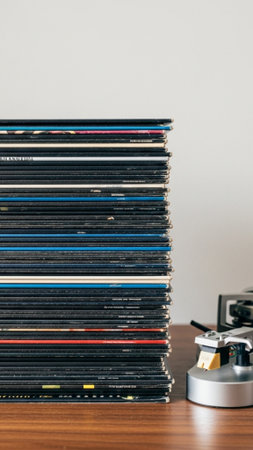 A vertical (9:16) composition featuring a towering stack of unused vinyl records, suggesting samba o