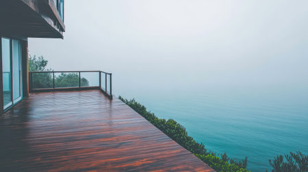 A tranquil view from a wooden deck overlooking the calm ocean on a foggy day, surrounded by lush greenery and a serene atmosphere.