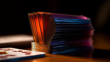 A stack of playing cards on a wooden table. The cards are red and white and are piled on top of each other. Concept of anticipation and excitement, as if someone is about to play a game of cards