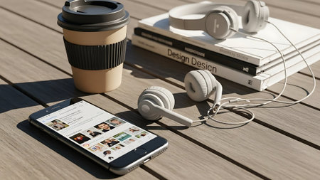 overhead view of white headphones, vintage book and smartphone on a deck hammock for a relaxing moment