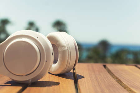 Headphones on the table in the palm tree forest. Summer vocation. Listen music. Close up. Cropped. Concept