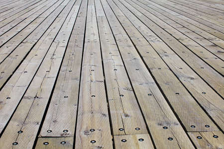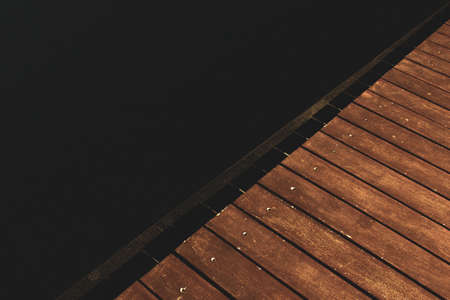 A play of lights and shadows on the boards of a wooden pier. The light falling on the boards at a high angle emphasizes the structure of the material