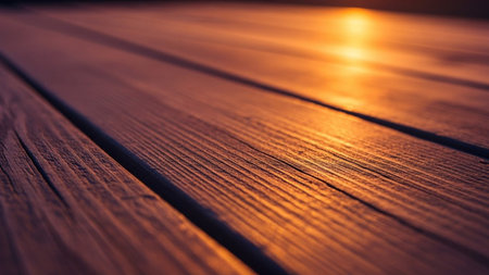Close-up of weathered wooden planks showing grain detail with warm orange sunset light reflecting.