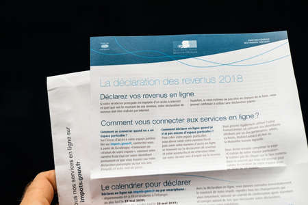 Paris, France - Apr 9, 2019: Man reading holding la declaration des revenus income statement instruction before submitting pre-filled income statement to French authorities and income tax instruction for previous year