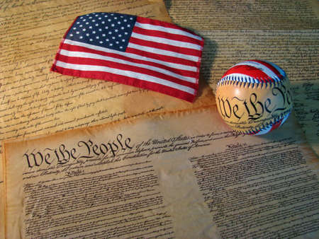 A copy of the Constitution of the United States accompanied by a flag and a baseball with the words of the Constitution on it.