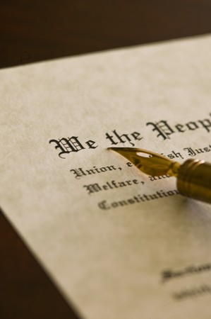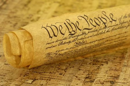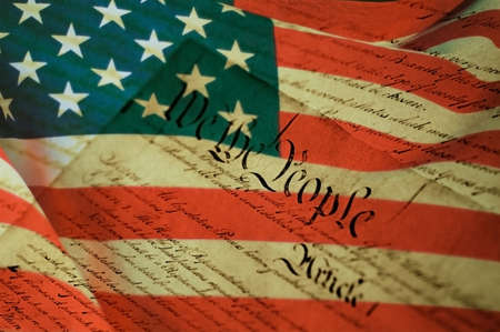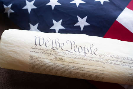 Closeup of a replica of U.S. document of American constitution We the people with USA Flag.