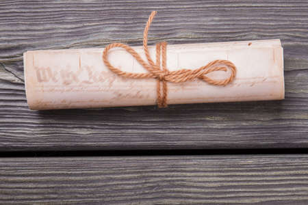 Close-up old scroll on wooden desk. Rolled paper on grey wooden table.