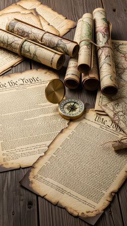 Stack of aged old maps and antique papers with vintage compass laying on wooden table surface.