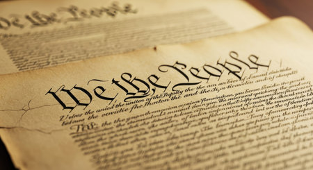 A close-up view of the opening words We the People on a vintage parchment document. This imagery evokes concepts of constitutional law, history, and governance.