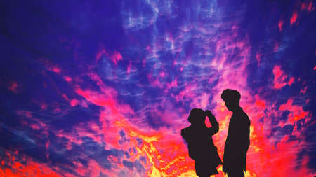Two people, men and women, look at the sunset