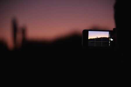 Female hand holding smart phone and taking photo of sunset