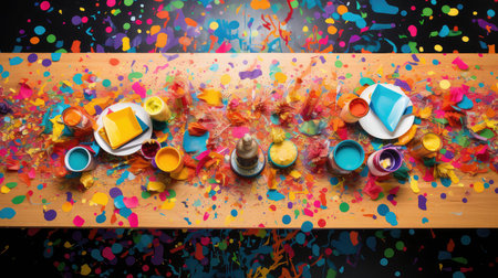 A bright yellow plastic cup sits amidst vibrant paint splatters on a messy artist's table, capturing the essence of creativity and playful expression in an art studio.