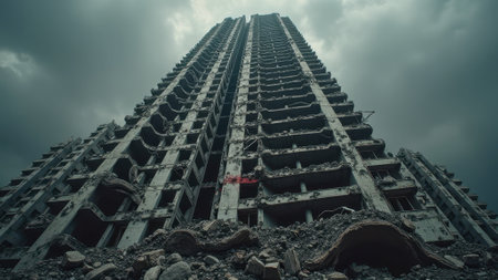 That the image is generated using AI. Abandoned high-rise building against stormy sky.