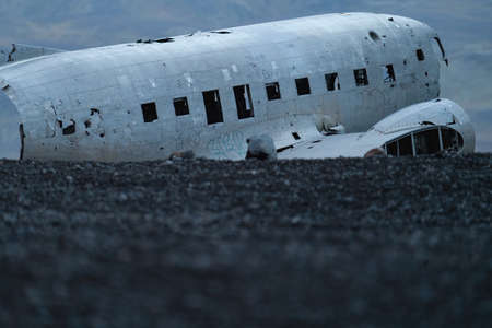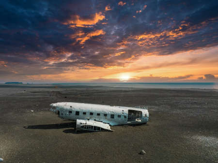 Aerial view of the old crashed plane abandoned on Solheimasandur beach near Vik,Iceland.
