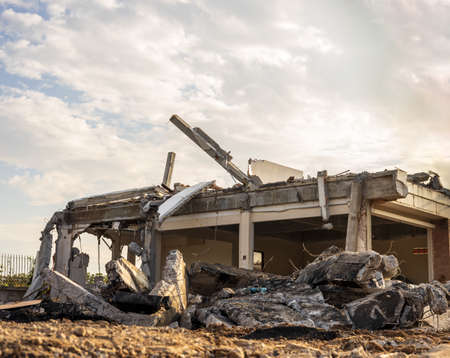 A low angle view of the rubble of an old abandoned building on the ground that has been demolished for renovation against a cloudy afternoon.