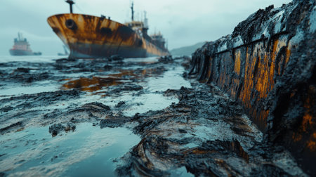 Rusty shipwrecks dot the shoreline, partially submerged in muddy waters. The gloomy sky casts a gray hue over the scene as the tide ebbs, revealing the rugged sediment around the vessels.