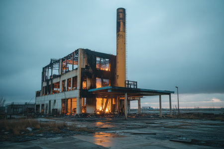 A burnt-out factory stands tall against a darkening sky, its windows glowing faintly with remnants of fire. The desolation evokes a haunting beauty in the dim light of twilight.