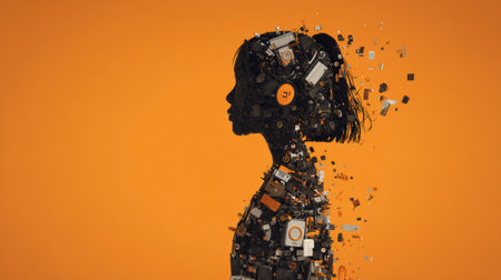 Abstract monochrome visual of a human head sculpture cracking and falling apart into pieces. Symbolizes mental health issues, stress, breakdown, anxiety, fragility, and psychological pressure. Modern conceptual art.