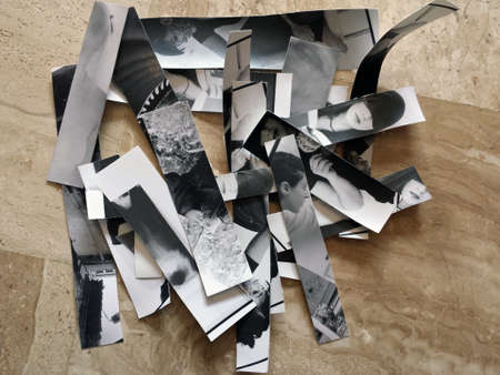 A man's face is made up of paper cutouts. The image is a collage of different shapes and sizes, creating a unique and abstract representation of the face. Scene is somewhat chaotic and disordered