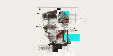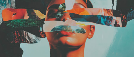 A creative portrait blending art and digital imagery, capturing emotions and stories within a fragmented visual narrative.