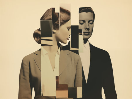 A vintage fashion collage portrait of a couple, featuring a woman in a brown suit and a man in a black suit. Their faces are partially obscured by geometric shapes. The image has a retro feel and is reminiscent of vintage fashion photography.