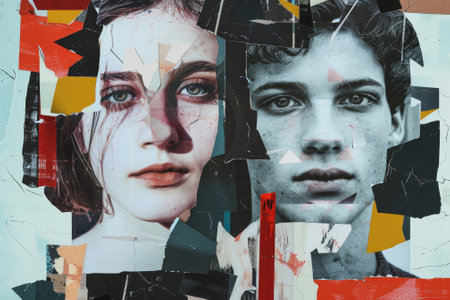 A woman gazes thoughtfully while her profile is framed by an artistic collage of torn paper and paint, reflecting creativity and depth in an urban art setting.