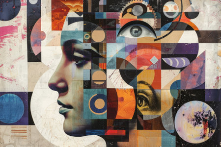 A contemporary digital art piece depicting a fragmented portrait with vibrant colors and geometric patterns on a creative backdrop