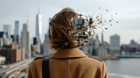 A man in a brown coat stands against a city skyline, wearing headphones. His head partially transitions into an abstract urban landscape, symbolizing imagination and thought.