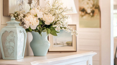 Elegant minimalist living room with decorative flowers and soft lighting during daytime
