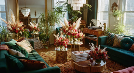 A cozy living space filled with vibrant plants and warm light, showing chic textures and nature-inspired art. A perfect blend of comfort and style, created with Generated AI