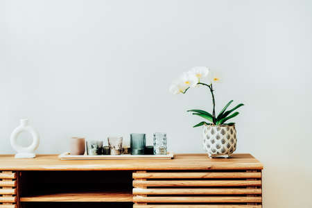 White orchid in blossom and tray with candles on the wooden cabinet against gray wall in modern scandinavian Minimalist home interior. Home decorated with flowers. Selective focus, copy space.