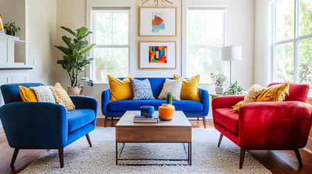 A stylish modern living room featuring colorful artwork, elegant furniture, and vibrant decor, creating a cozy and inviting atmosphere for relaxation.