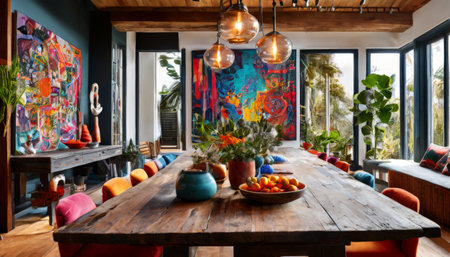 Eclectic dining room with rustic table and vibrant art