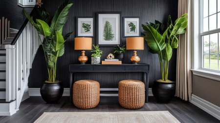 Designer home entry area with statement lighting, console table, and curated accessories