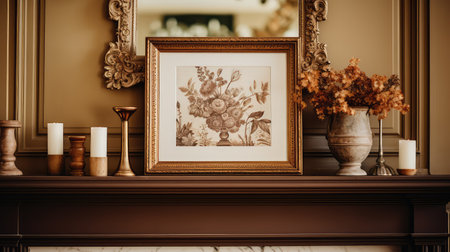 Assorted empty picture frames with decorative flowers and photos on light background. That the image is generated using AI.