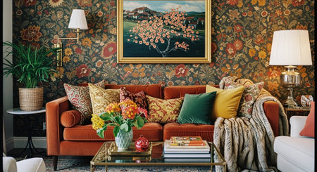 This image depicts a lively and colorful living room adorned with eclectic decor. The room features a variety of vibrant cushions on the sofa, numerous framed artworks on the walls, and an assortment of potted plants. A wooden coffee table sits in the center, surrounded by comfortable seating arrangements. The space is further enhanced by a large area rug, vintage furniture, and warm lighting from table lamps.