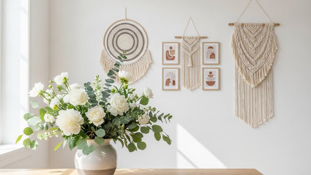 showing bohemian style interior decor with white roses and macrame wall hangings on a white wall.