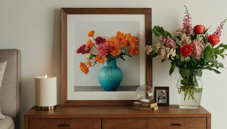 Interior of modern living room with wooden chest of drawers, vase with flowers and photo frame
