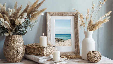 Wicker basket with dried flowers, burning candles and wicker vase with sea view