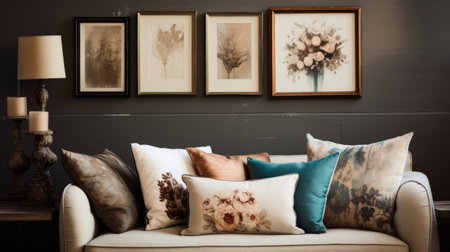 a home adorned with delicate floral studies, dark teal and dark bronze accents, and staged photography. the australian tonalism and industrial feel are enhanced by the combination of dark gray and light beige tones. the space is beautifully decorated with pillows, lamps, and framed pictures, creating a captivating blend of floral still-lifes. ai generated
