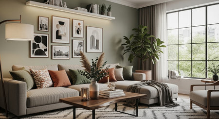 Interior of modern living room with green sofa, plants and posters