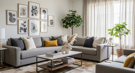 modern living room with grey sofa and black picture frames on the wall
