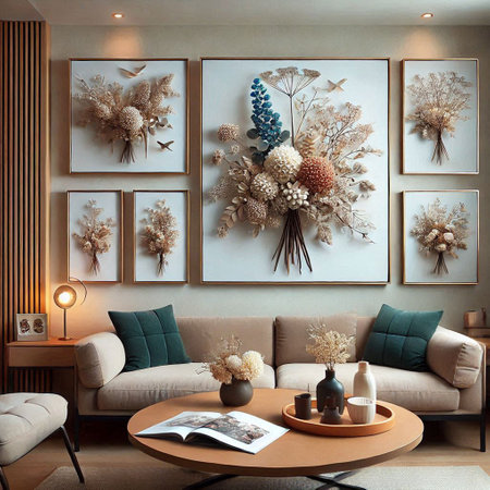 This image showcases a cozy living room with a rustic and elegant decor. The room features a white sofa adorned with various throw pillows in neutral and earthy tones. A wooden coffee table sits in front of the sofa, holding a vase with dried flowers, a stack of books, and a mug. The wall behind the sofa is decorated with an assortment of framed art pieces, adding a touch of sophistication. Two side tables with lamps flank the sofa, providing soft lighting. The overall ambiance is warm and inviting, perfect for relaxation.