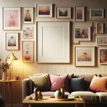 Living room interior with sofa, coffee table and picture frames on wall