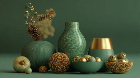 3d render of green vase with golden easter eggs.
