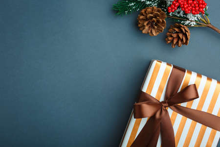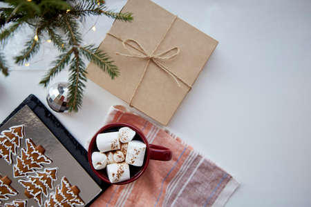 Festive background card with gift box, crafting decoration, branch of fir tree, cocoa with marshmallows and Christmas cookies. Modern DIY style. Merry Christmas concept, copy space. High quality photo