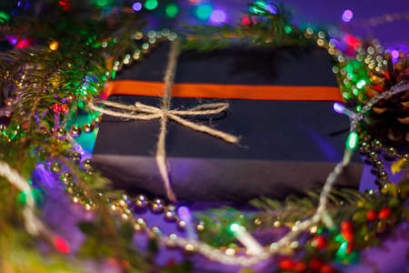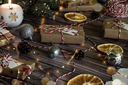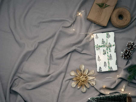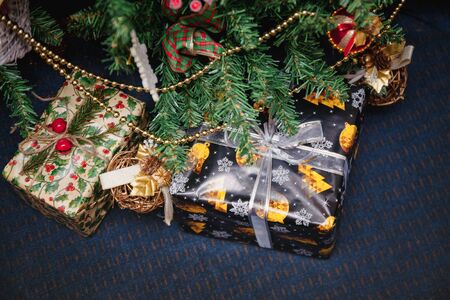 Christmas gifts surrounded by Christmas decorations. Snowflakes and leaves on a Christmas tree