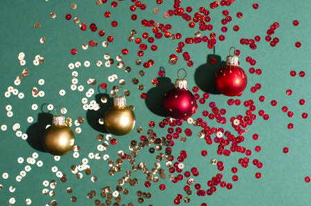 Top view of four Christmas festive decoration gold and red toy balls with sequins glitter on a mint green background.