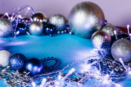 Christmas frame with decorations on blue background, copy space for the text. Merry Christmas and Happy New Year